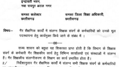 रायपुर/कोरबा (आई.बी.एन -24) गैर शैक्षणिक कार्यों में संलग्न शिक्षक संवर्ग के कर्मचारियों को उनके मूल पदस्थापना हेतु कार्यमुक्त किये जाने…